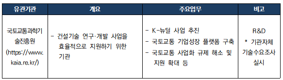 국토교통과학기술진흥원을 통해 건설기술 분야에 대한 R&D 등을 지원하고 있으며,