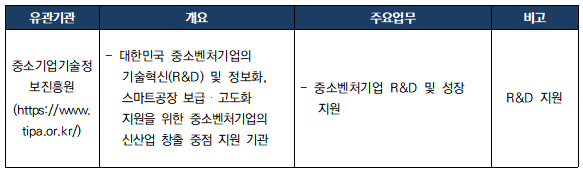 부처 산하 기관으로 중소기업기술정보진흥원이 있으며, R&D 및 투자 등
